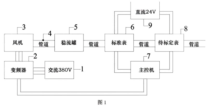 直流電源分別對(duì)標(biāo)準(zhǔn)表、熱式氣體質(zhì)量流量計(jì)及主控機(jī)供電,標(biāo)準(zhǔn)表及熱式氣體質(zhì)量流量計(jì)的數(shù)字輸出端分別連接主控機(jī)的輸入端,主控機(jī)的控制輸出端連接變頻器技術(shù)效果:現(xiàn)有技術(shù)中,需要到其他滿足標(biāo)定條件的實(shí)驗(yàn)室去進(jìn)行標(biāo)定,產(chǎn)品每次標(biāo)定需要花費(fèi)上千元,則公司每年節(jié)省了幾十萬(wàn)的費(fèi)用,且本實(shí)用新型所設(shè)計(jì)的標(biāo)定系統(tǒng)準(zhǔn)確度極高,操作簡(jiǎn)便,適于大力的推廣和使用。