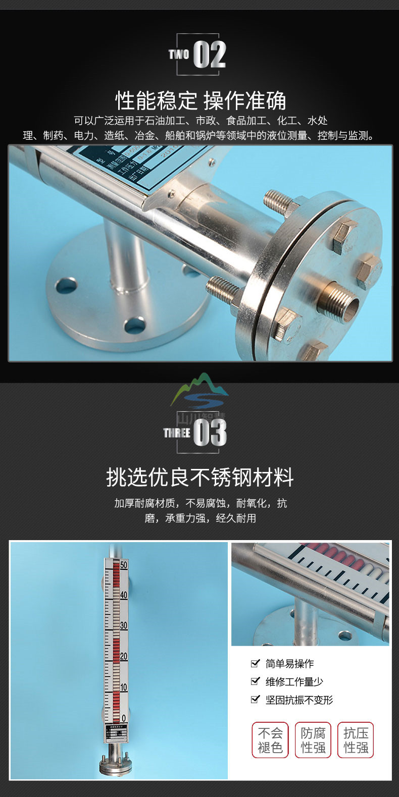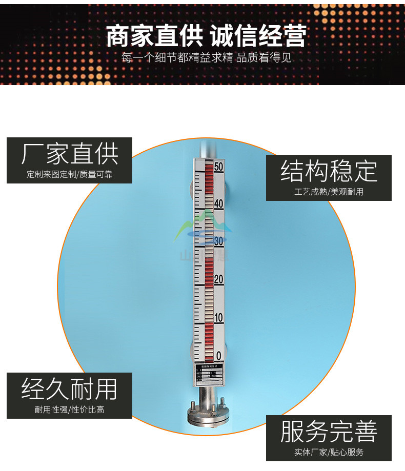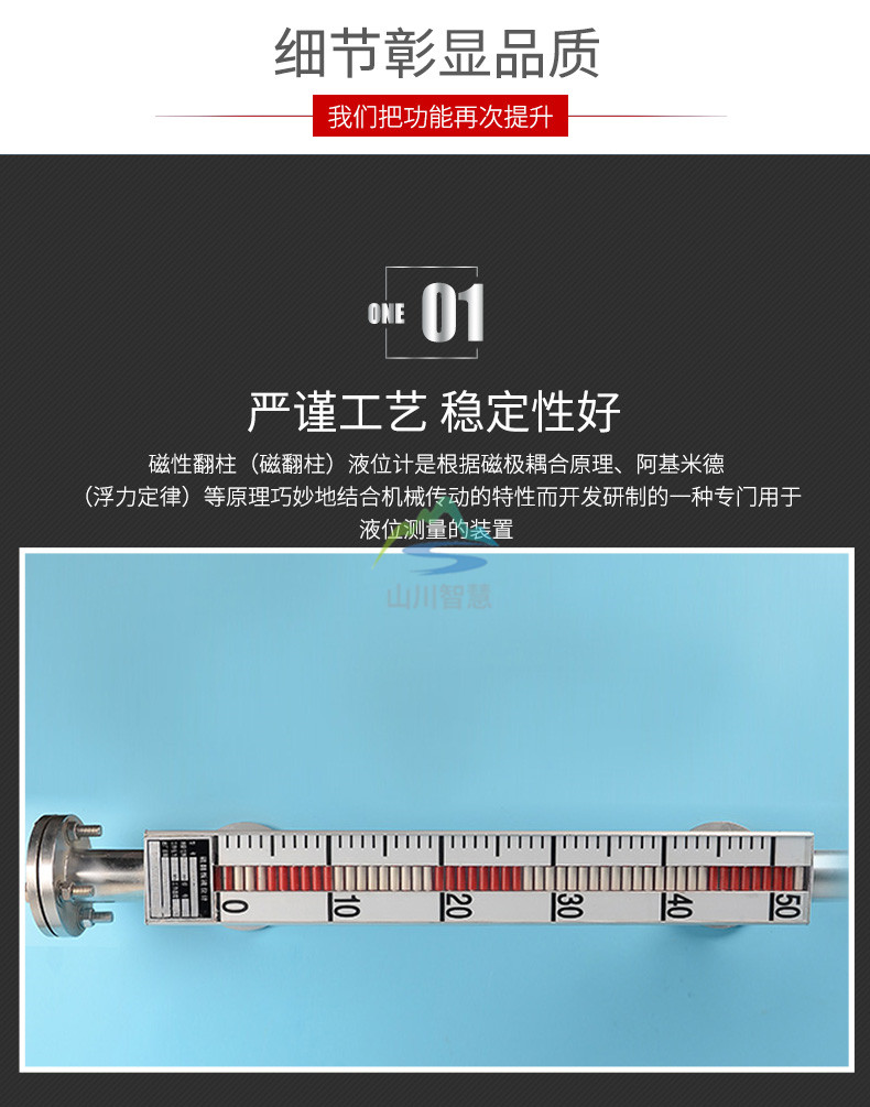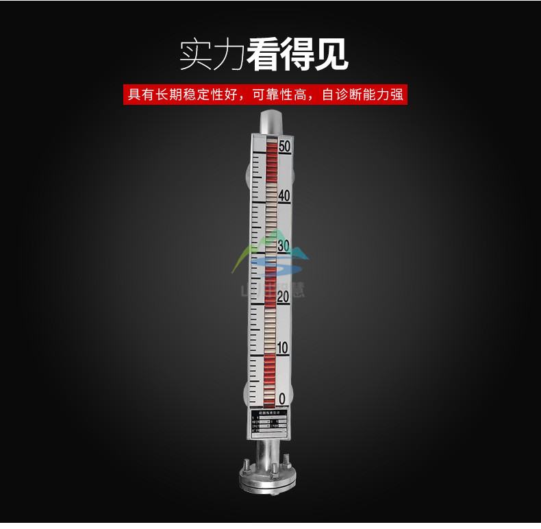根據(jù)浮力原理,浮子在測量管內(nèi)隨液位的升降而上、下移動,浮子內(nèi)的**磁鋼通過耦合作用,驅(qū)動紅、白色翻柱翻轉(zhuǎn)180°,液位上升時翻柱由白色轉(zhuǎn)為紅色,下降時由紅色轉(zhuǎn)為白色,從而實現(xiàn)液位指示。